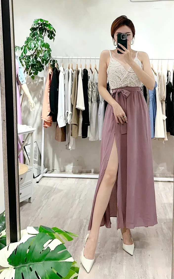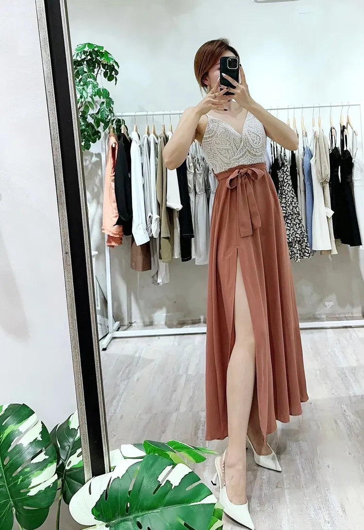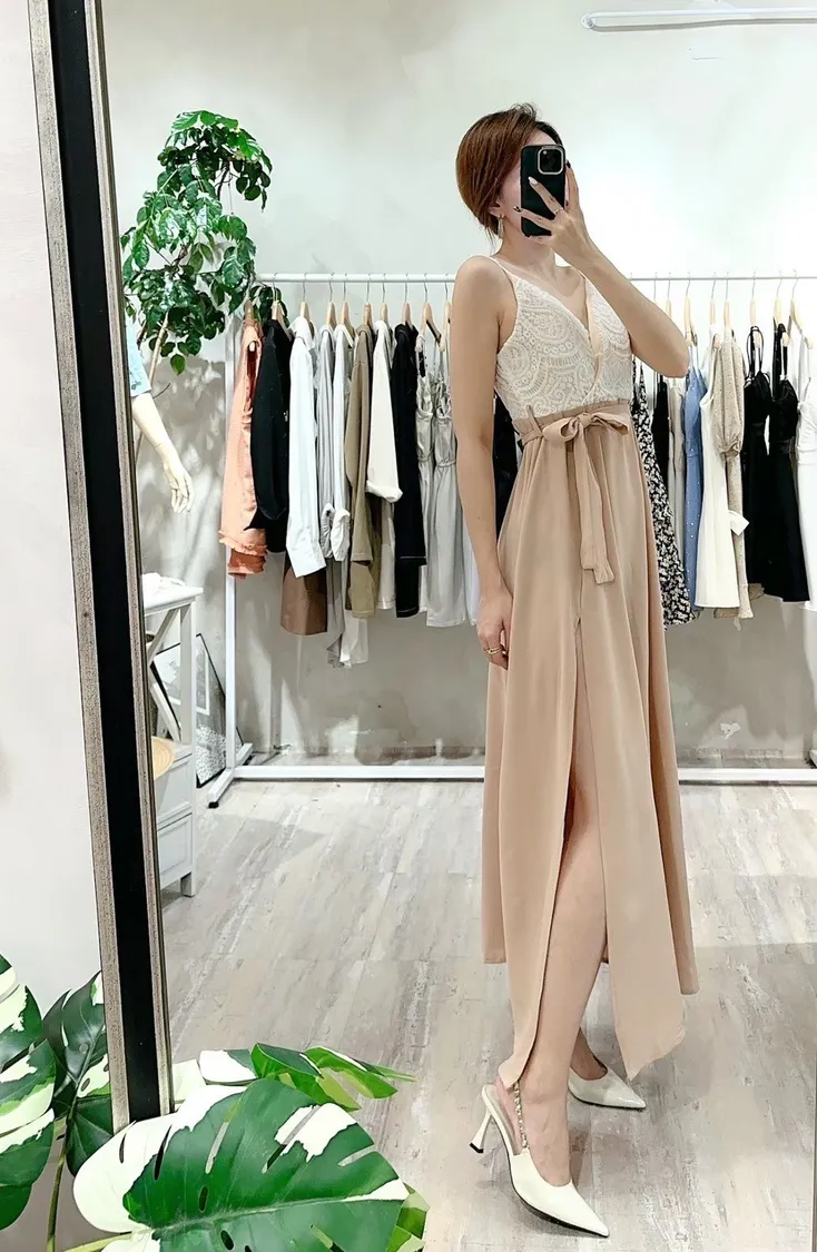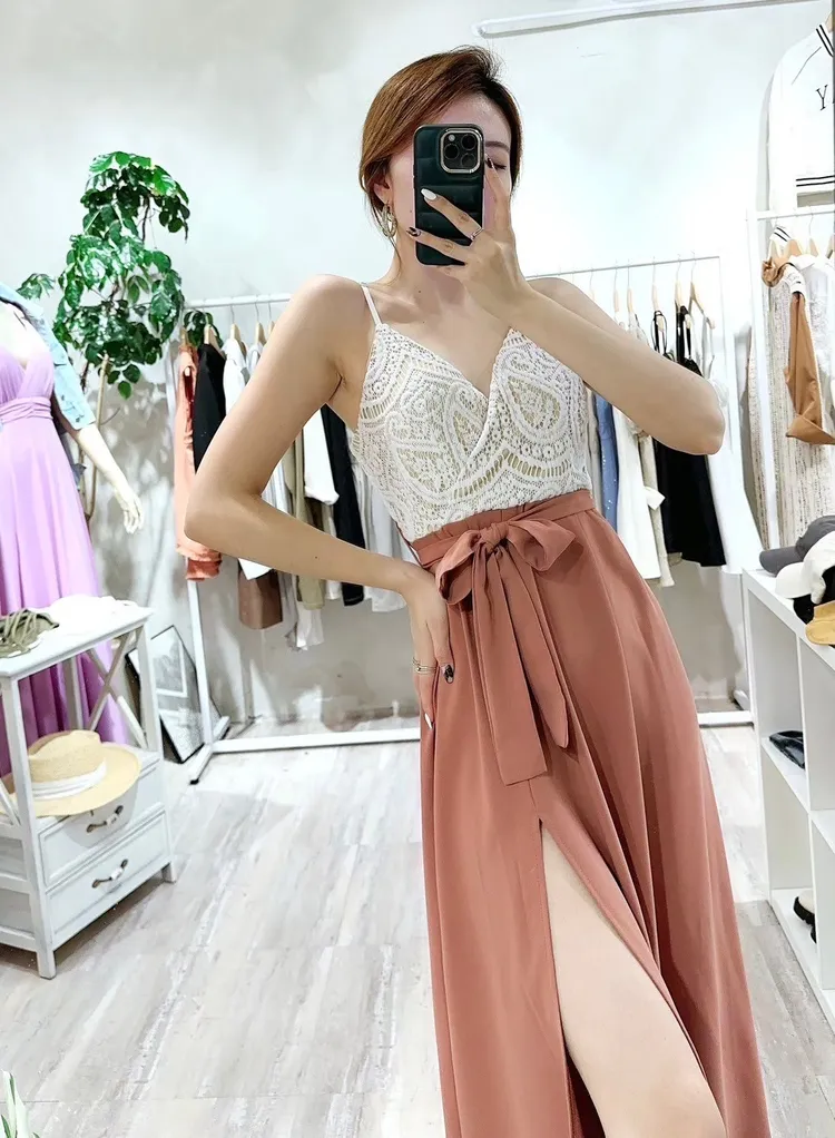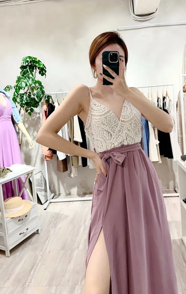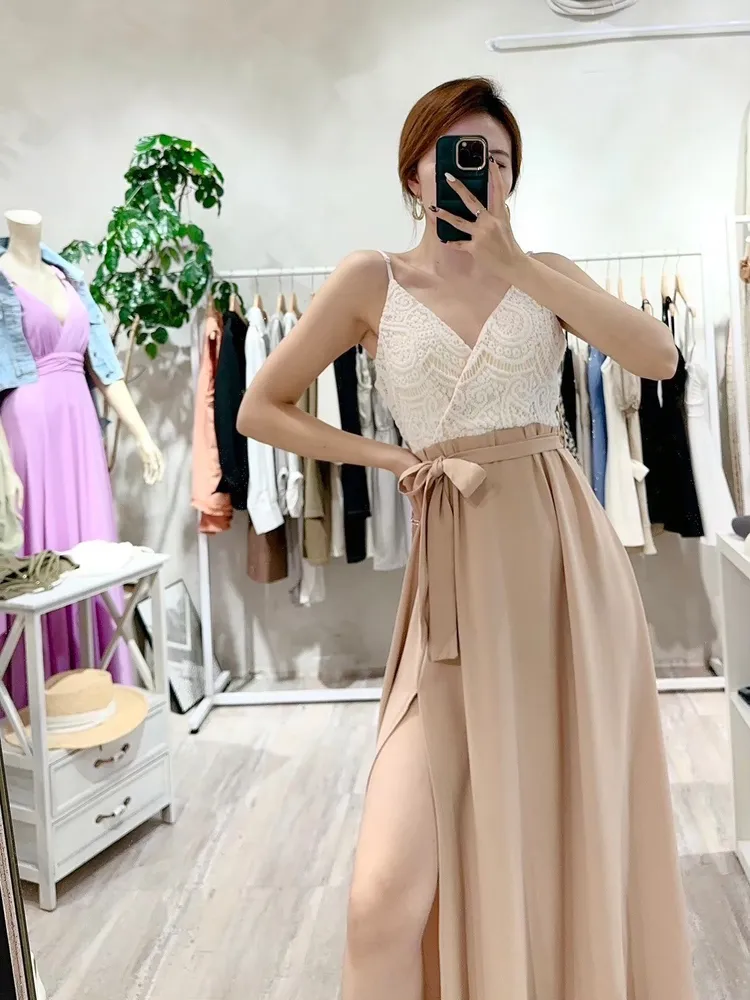 胸蕾絲開岔長洋